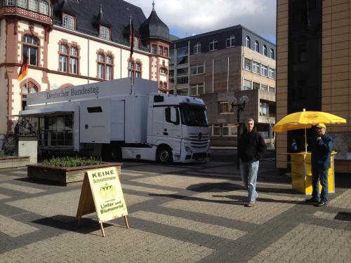 Da die Angelegenheit Südumgehung Limburg keinesfalls erledigt ist, wird der Verein wieder Stände in der Stadt Limburg zur Information der Bürger veranstalten: jeweils Samstag am 13.04., am 18.05. und am 22.06. Von 10:00 Uhr bis 13:00 Uhr. In der Fußgängerzone an der Ecke Europaplatz/Volksbank.